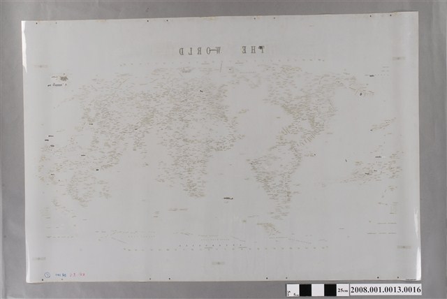 本物件是吳信政教授製作〈世界全圖〉印刷製版用膠片之一,成圖比例尺兩千五百萬分之一,編繪者為吳信政、邱淑敏,1989年8月由甘霖出版社出版。館藏號2008.001.0045為其印刷成品。