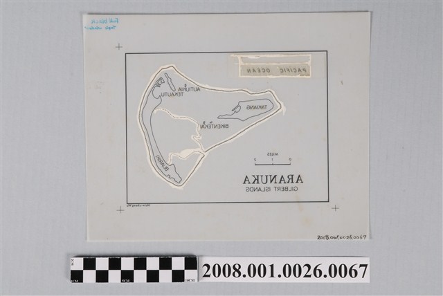 本件是吳信政教授製作的阿拉努卡環礁(Aranuka)英文地圖的製圖膠片,為作者在夏威夷大學進修時的手繪彩色地圖作業,時間在1977-78年間。