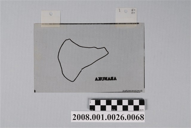 本件是吳信政教授製作的阿拉努卡環礁(Aranuka)英文地圖的製作膠片,為作者在夏威夷大學進修時的手繪彩色地圖作業,時間在1977-78年間。