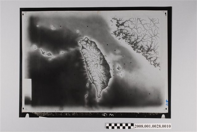 本物件為吳信政教授繪製橫版臺灣地圖之膠片之一。 本膠片為陽片印刷片,內容為完整圖層依CMYK分色之藍色。成圖製作範圍為臺灣、澎湖及附屬島嶼,內容包含主要城市、主要公路、高速公路、鐵路、機場、水系等資訊,地形展現為分層設色加暈渲,為普通地理圖。