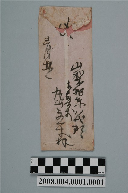 本件為明治30年(1897)12月,山梨縣丸山文平寄臺灣守備步兵第一聯隊第一大隊本部丸山源平書信之信封。信封正面為收信者丸山源平與其部隊之名稱,上貼有二錢郵票與臺灣基隆明治30年12月之郵戳,背面則為寄件人之姓名與地址。