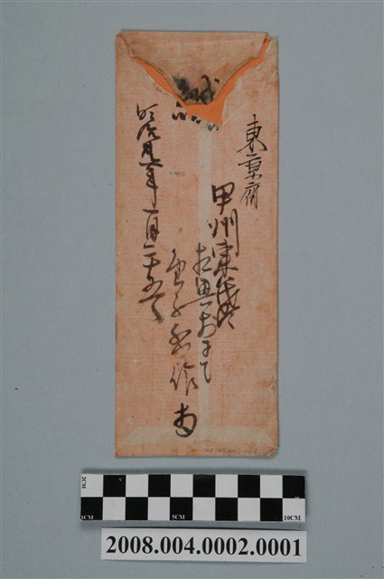 本件為明治31年(1898)1月25日,東京府寄臺灣守備步兵第一聯隊第一大隊本部丸山源平書信之信封。信封正面為收信者丸山源平與其部隊之名稱,上貼有二錢郵票與臺灣基隆明治31年1月25日之郵戳,背面則為寄件人之姓名與地址。