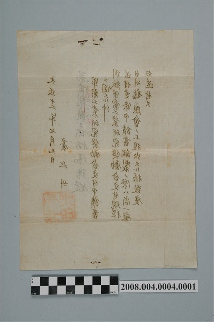 本件為大正12年(1923)7月9日,臺北州寄給何勝珠之軍需工業研究獎勵金交付申請書相關文件。日本政府為希望國內民間業者能對軍需工業進行研究,因此訂有獎勵辦法,本件收件人何勝珠為製靴工場業者,當局即是希望何氏能以其專業,為日本軍方效力。此件之目的即是希望何勝珠對臺北州廳進行照會。