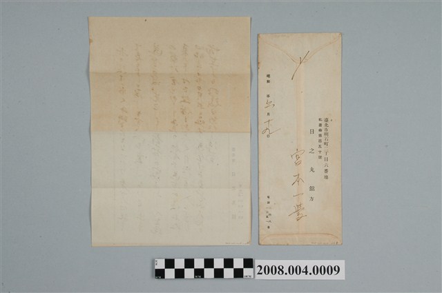 本組為昭和10年(1935)6月10日,臺北市日之丸館宮本一學寄京都市小野田豊之書信,內容為有關設備費用之說明。信封正面貼有三錢郵票。日之丸館是臺北市當時重要的旅社之一,位於今南陽街附近,日治時期梁啟超來臺時曾住宿於此。