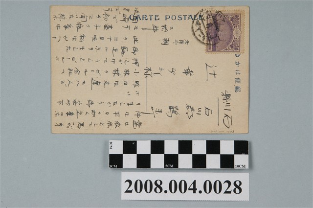 1.本物件以臺灣船隻為主題,黑白樣式。正面為日本郵船會社信濃丸航行於海面之圖像。明信片上方有一藍色、白色相間之旗子,旗子下方以英文字母書寫「N.Y.K.S.S Shinano maru」。由圖像可見信濃丸船身狹長,且外表為黑色,船身中央的煙囪正吐出極濃的黑煙。明信片下方由左至右以漢字書寫「臺灣航路船」、「日本郵船會社 信濃丸」、「總噸數六千三百八十二噸」。明信片左上方有一「感狀」,以漢字與日文書寫「假裝巡洋艦信濃丸明治三十八年五月中敵艦對,北上對,連日連夜哨戒勤務,同月拂曉早ワモ敵艦隊發見其確實迅速警報聯合艦隊作戰,利ハシコト少ナカラス其功績大ナㇳモノナ 明治三十八年六月二十日聯合艦隊司令長官東鄉平八郎」(大意為信濃丸於明治三十八年五月連夜警戒站哨,發現敵方艦隊,速速聯合艦隊作戰,其功績之大。明治三十八年六月二十日聯合艦隊司令長官東鄉平八郎)。背面右上角為郵票黏貼處,該處有一黑色戳章,字跡模糊不清。右側有以漢字、平假名書寫之「郵便はがき」,上方以英文字母書寫「CARTE POSTALE」。由書寫痕跡可知該明信片寄往「石川縣石川郡鵑來町」。