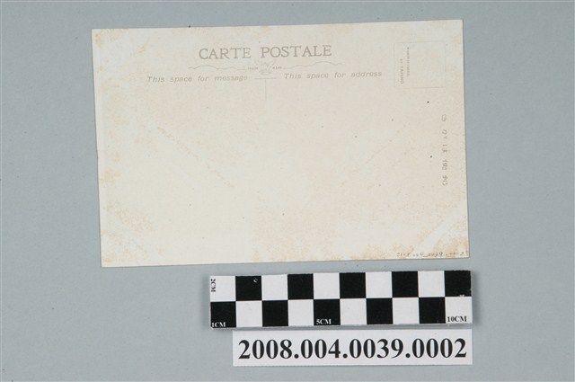 1.本物件以角板山為主題,彩色樣式。正面為角板山貴賓館由入口處向內拍之正拍圖像。其門口處以木頭製作,牆面上刻有交錯的花紋。貴賓館為日式建築,屋頂為深色,門口主要配色為白色、拉門為棕色。明信片右下角以漢字書寫「臺灣 蕃地 角板山」、「貴賓館」,以英文字母書寫「KAPPANZAN TAIWAN」。明信片左下方有一建築物、建築物兩旁有樹木的圖樣。背面右上角為郵票黏貼處,右側有以漢字、平假名書寫之「郵便はがき」,上方以英文字母書寫「CARTE POSTALE」、「This space for message」、「This space for address」,中間有一鳥類圖像,兩旁以「TRADE MARK」標示。2.角板山日治時期隸屬新竹州,位於今日桃園縣。角板山曾設有交易所,交易所為日人控制原住民經濟生活動重要單位。角板山貴賓館建於西元1914年(大正3年),為日洋混和的建築樣式。