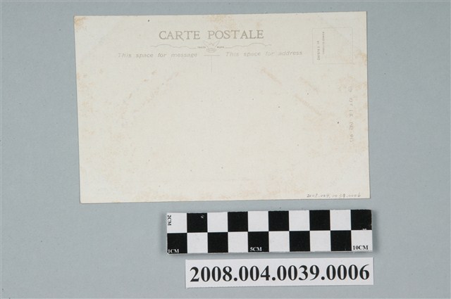 1.本物件以角板山為主題,彩色樣式。正面為一男一女的原住民族人站立於一竹子所編成的房子前。左方為男性,穿著深藍色傳統服飾。右方為女性,穿著黃色、深色格紋傳統服飾,腰間綁上綠色衣物。該男女頭上皆綁有白色頭巾、赤腳。其腳邊有數片木頭堆置於地上。明信片右下角以漢字書寫「臺灣 蕃地 角板山」、「蕃社」,以英文字母書寫「KAPPANZAN TAIWAN」。明信片左下角有一原住民頭像。背面右上角為郵票黏貼處,右側有以漢字、平假名書寫之「郵便はがき」,上方以英文字母書寫「CARTE POSTALE」、「This space for message」、「This space for address」,中間有一鳥類圖像,兩旁以「TRADE MARK」標示。2.角板山日治時期隸屬新竹州,位於今日桃園縣。角板山曾設有交易所,交易所為日人控制原住民經濟生活動重要單位。