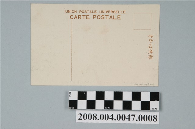 1.本物件以臺灣全島名所為主題,黑白樣式。正面為赤崁樓之側拍圖。由圖像可見當時赤崁樓周遭建有較矮的中式建築物。明信片下方以漢字書寫「臺南赤崁樓(蘭人築城)」、以英文字母書寫「THE SHEIKISHIRO TAINAN.」。背面右上角為郵票黏貼處,右側有以漢字、平假名書寫之「郵便はがき」,上方以英文字母書寫「CARTE POSTALE」、「UNION POSTALE. UNIVERSELLE」。2.赤崁樓係西元1653年由荷蘭人所建,時稱普羅民遮城、プロビンシヤ城址、紅毛城;1661年鄭成功驅逐荷蘭人後將此樓稱為承天府以統治臺灣,1879年清廷在此基礎上建文昌閣、海神廟與蓬壺書院,西元1895年後曾作為陸軍衛戍醫院及臺南師範學校使用。現存建物為其殘跡,以及海神廟與文昌閣。