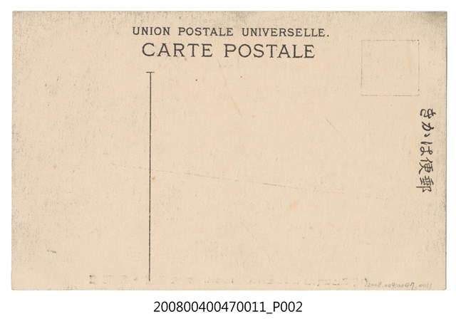 1.本物件以臺灣全島名所為主題,黑白樣式。正面為兩名臺灣人正在抬轎之圖像。其中右側的抬轎人,就地坐在草地上休息。兩人皆戴著草帽。明信片下方以漢字與日文書寫「臺灣簥ト臺灣人」、以英文字母書寫「PALANQUIN&FORMOSAN, FORMOSA.」。背面右上角為郵票黏貼處,右側有以漢字、平假名書寫之「郵便はがき」,上方以英文字母書寫「CARTE POSTALE」、「UNION POSTALE. UNIVERSELLE」。2.轎子為中國古代即開始使用的一種交通工具,原先僅為貴族所使用之代步工具,至唐代開始民間婦女或是官員也開始有乘坐轎子之習慣,雖速度較慢,但在一些地形較崎嶇複雜或是街道較狹窄的地區,轎子是比馬車等交通工具更為方便,通常分為亮轎與暗轎,有時亦會因身分地位不同分為不同的轎種。