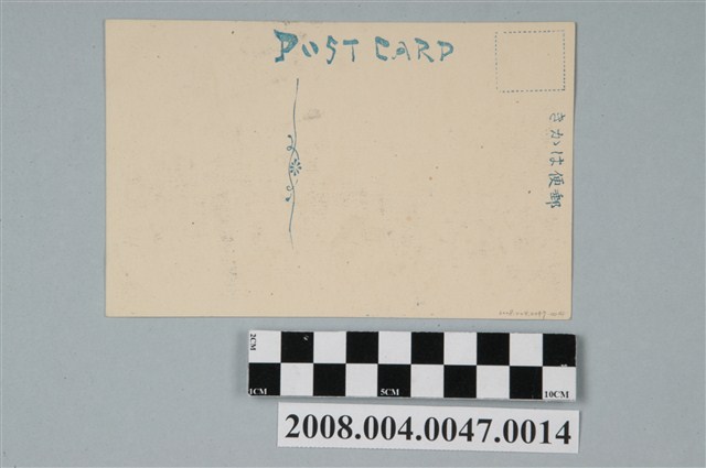 1.本物件以臺灣全島名所為主題,黑白樣式。正面為臺灣神社之側拍圖。由圖像可見臺灣神像設有架高石燈籠、一重鳥居。明信片左方有一座雕塑物。明信片上方以漢字手寫「台灣神社」。背面右上角為郵票黏貼處,右側有以漢字、平假名書寫之「郵便はがき」,上方以英文字母書寫「POST CARD」。2.臺灣神社建於西元1901年,位於臺北州劍潭附近的劍潭山山頂,曾被指定為重要史蹟。該神社主要祭祀北白川宮能久親王。