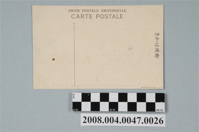 1.本文物為以臺灣總督府官邸為主題之明信片,正面為臺灣總督府官邸黑白照片,畫面中可見其建物側面部份樣貌,照片由圍牆外拍攝,無法看清全貌,門口站有1人,下方有2段文字,第1段「(32)FORMOSA GAVERNORGENEAL OFFICAL RESUDENCE」,第2段「臺灣總督府官邸」;背面為空白明信片橫式書寫面,以黑色單色印刷,右上有郵票黏貼處,右側有「郵便はかき」字樣,上方有「UNION POSTALE UNIVERSELLE」及「CARTE POSTALE」2行字樣。2.臺灣總督官邸建於西元1901年,由福田東吾、野村一郎設計,1911年改建,1913年完工,外觀為華麗的巴洛克風,由森山松之助擔任建築師,是當時迎接日本皇族及國內外來賓的場所,也利用來宴請各地仕紳及提供表演活動的空間,現為國定古蹟臺北賓館。