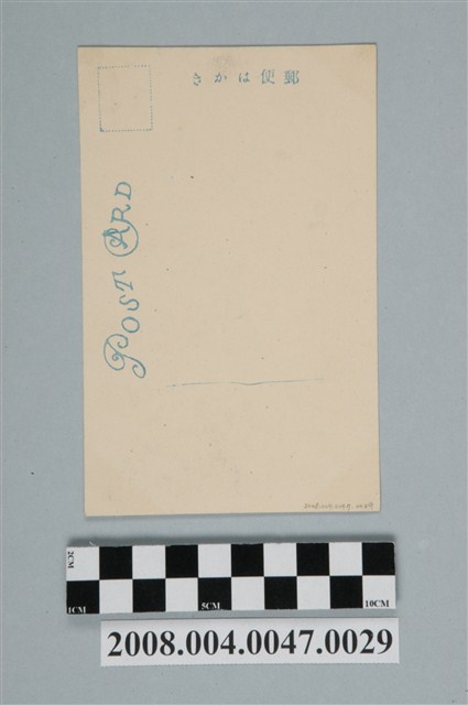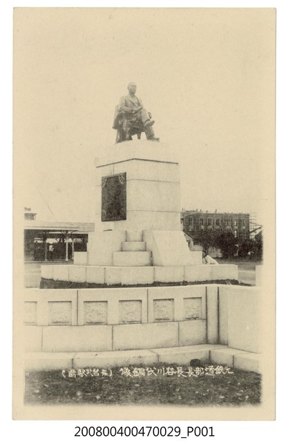1.本文物為以臺北站前原鐵道部長長谷川氏銅像為主題之明信片,正面為長谷川氏銅像黑白照片,畫面中可見銅像坐落於白色平台上,為坐姿,翹起1腿,下方有1段文字「元铁道部長長谷川氏銅像(在臺北駅前)」;背面為空白明信片直式書寫面,以藍色單色印刷,左上有郵票黏貼處,上方有「郵便はかき」字樣,左側有「POST CARD」字樣。2.長谷川謹介為日本山口縣人,西元1899年來臺,擔任臨時鐵道敷部技師長,1900年臺灣鐵道部成立,擔任鐵道部技師長,1906年任鐵道部長,於任內完成縱貫鐵路通車,1911年於臺北車站內設立其銅像,但銅像最後於戰爭中遺失。