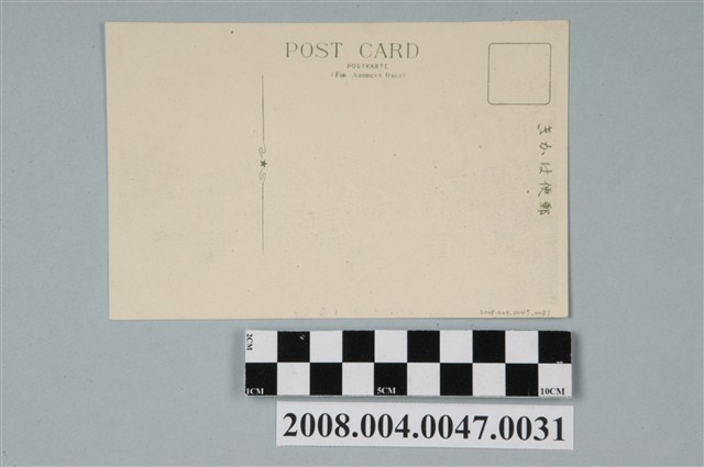 1.本文物為以春季之臺北苗圃為主題之明信片,正面為臺北苗圃一隅黑白照片,畫面中可見水畔波光粼粼,有1木頭搭建之休憩亭於水面上,左側則為小徑與路樹,照片下方有1段文字「(臺北)春ノ苗圃」;背面為空白明信片橫式書寫面,以黑色單色印刷,右上有郵票黏貼處,右側有「郵便はかき」字樣,上方有「POST CARD」及2行字樣,由上至下為「POSTKARTE」、「(FOR ADDRESS ONLY)」。2.臺北植物園創設於西元1895年,為瞭解本島樹種,選定臺北小南門陸軍用地作為苗圃用地,1900年購入農地進行開墾整地及樹苗移植,始稱「臺北苗圃」,1921年改名「臺北植物園」,創立目的是為了培育熱帶植物,熟悉南洋各種植物與生態環境,以作為進軍南洋的準備。