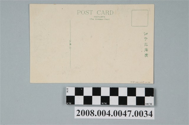 1.本文物為以艋舺觀慈仔街為主題之明信片,正面為觀慈仔街一隅黑白照片,畫面中可見兩側樓房緊鄰,路上有1車具載有貨物,照片下方有1段文字「(臺北)艋舺觀慈仔街」;背面為空白明信片橫式書寫面,以黑色單色印刷,右上有郵票黏貼處,右側有「郵便はかき」字樣,上方有「POST CARD」及2行字樣,由上至下為「POSTKARTE」、「(FOR ADDRESS ONLY)」。2.艋舺觀慈仔街應為歡慈市街,其清代名稱為「番薯市街」,為臺北市早期形成之聚落,約位於今貴陽街二段青山宮與環河南路間,其名稱由來為早期漢人與平埔族於此處進行交易,而交易物多以番薯為主。