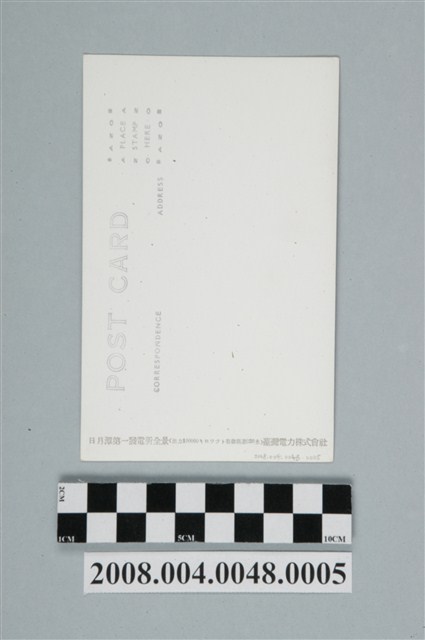 2.正面影像滿版印刷,無文字。背面則印有「POST CARD、CORRESPONDENCE、ADDRESS」等字,郵票黏貼位置由4組「AZO」文字組成方框,內有「PLACE STAMP HERE」等字,以及說明文字「日月潭第一發電所全景(出力100000キロワット有效落差320米)、臺灣電力株式會社」。