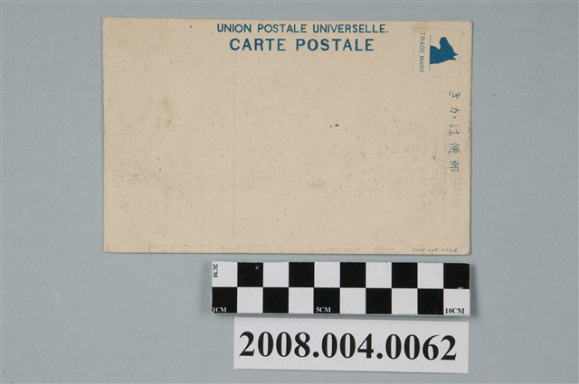 1. 本物件為以明治紀念拓殖博覽會烏龍臺灣喫茶亭為主題之明信片,其正面為臺灣喫茶亭黑白照片,影像中央有1座以甘草或茅草為屋頂三角平房建築物,其屋頂上方有1個疑似鳳梨的物體,其上插有1面寫有「臺灣喫茶店」,影像下方有「明治紀念拓殖博覽會」、「ウーロン臺灣喫茶亭」、「THE TAKUSHOKU EXPOSITION AT TENNOJI PARK.」。背面為空白明信片直式書寫面,以藍色單色印刷,左上方框中有一馬頭側影,下方有「TRADE MARK」、上方有「郵便はがき」,左側有「UNION POSTALE UNIVERSELLE.」,中間偏下有分隔線。2. 西元1913年為了紀念明治時期的功業,於4月21日至6月19日大阪天王寺公園舉辦「明治紀念拓殖博覽會」,其建築物包含美術館、機械館、公會堂、勸業館、風光館等,並設有臺灣喫茶店,其位置位於勸業館入口前,為竹造牆壁的平房建築物,並以14、15歲的臺灣少女作為店內的接待員。