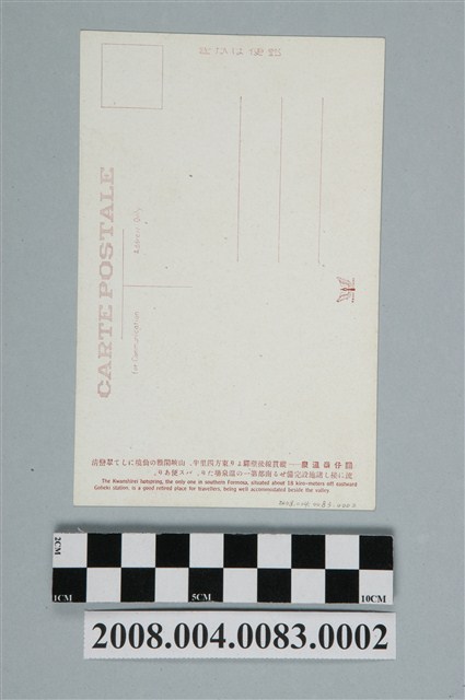 1. 本物件為以關仔嶺溫泉為主題的明信片。正面為關仔嶺溫泉的彩色圖片,有一紅橋連接河流兩岸,右岸房屋林立。背面為書寫面,右上角為郵票黏貼處,右側印「郵便はかき」,上方印「CRATE POSTALE」、「for Communication」、「Address only」。下方有一展翅鳥形商標。左側印「關仔嶺溫泉……縱貫線後壁驛より東方四里半、山峽閑雅の仙境にして翠巒清流に接し諸施設完備せる南部第一の溫泉場たり。バス便あり。」(關仔嶺溫泉,距離縱貫線後壁站東方四里半,是被眾山包圍閒雅的仙境,青翠的山巒連接著清澈的河流,設施完備,是南部第一的溫泉場。有巴士可達。)「The Kwanshirei hotspring, the only one in southern Formosa, situated about 18 kiro-meters off eastward Goheki station, is a good retired place for travellers, being well accommodated beside the valley.」2. 關子嶺地區境內包含關嶺里與仙草里,最早在清乾隆間就已開發,日治時期因發現溫泉大舉開發,與四重溪、北投、陽明山並列臺灣四大溫泉區。關子嶺為弱鹼性碳酸泉,因湧出時將青泥岩帶出而呈現灰黑色泥漿狀。