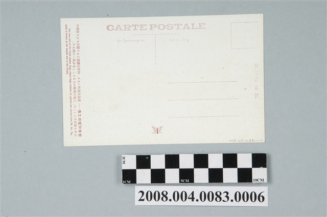 1. 本物件為以營林所製材工場為主題的明信片。正面為營林所製材工場的彩色圖片,中央為一貯木池,池邊放置數堆木材。右方有一木塔,中間有一正在冒煙的煙囪,左方有一紅色磚房。背面為書寫面,右上角為郵票黏貼處,右側印「郵便はかき」,上方印「CRATE POSTALE」、「for Communication」、「Address only」。下方有一展翅鳥形商標。左側印有「營林所製材工場……嘉義市檜町にあり、阿里山鐵道により搬出される紅檜の巨木を製材するところ、工場の規模の大なること東洋第一の稱あり。」(位於嘉義市檜町,將經由阿里山鐵路運出的紅檜巨木製成木材,工場規模之大可稱為東洋第一)、「The saw-mill of the forest station, Kagi, where huge timbers of cypress are carried from Mt. Ari. The scale is known as the largest one in the Orient.」2. 嘉義製材所設置於大正5年(1916),屬營林所管轄,位於阿里山鐵路終點北門火車站前,號稱東南亞第一製材工廠。光復後改稱嘉義第一製材工廠,專製販賣材,照片所見貯木池已改建為嘉義市立文化中心。