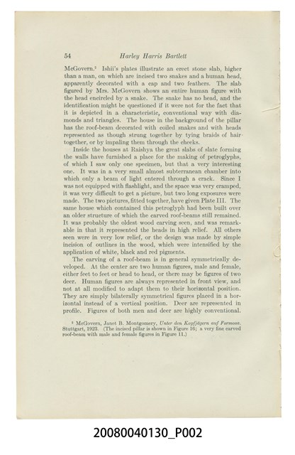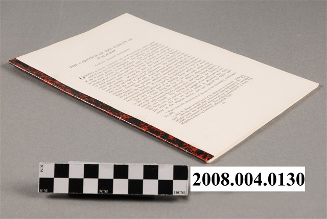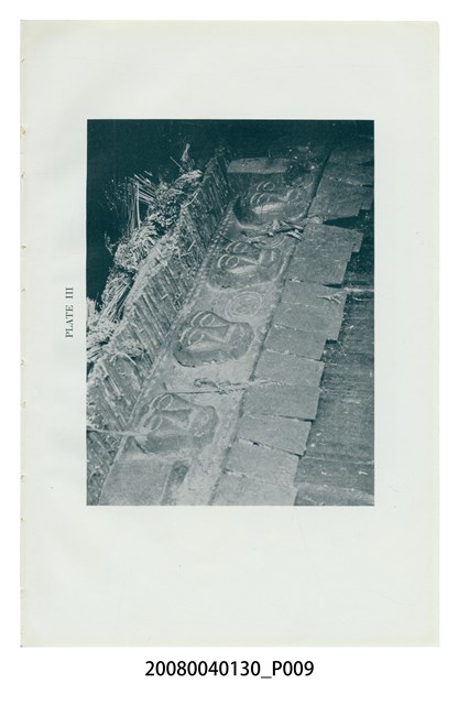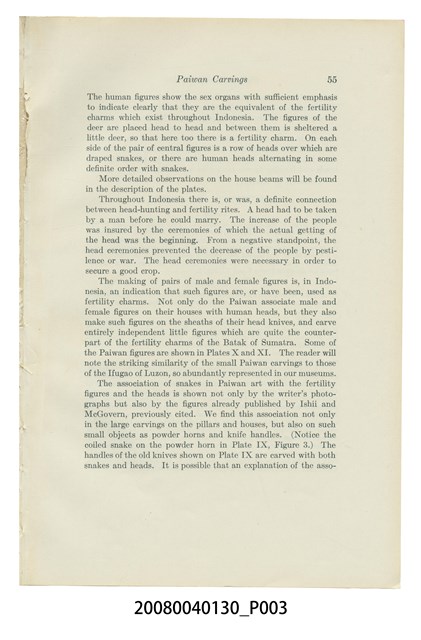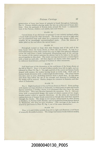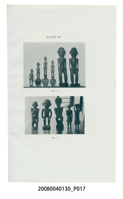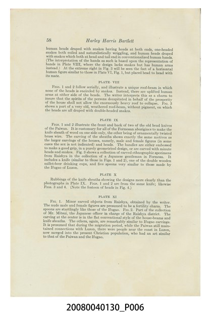 本物件為《福爾摩莎排灣族雕刻介紹圖集》,正面上方標有書籍名稱THE CARVINGS OF THE PAIWAN OF FORMOSA,下方應為作者HARLEY HARRIS BARTLETT,內容記述作者拜訪屏東來義社的排灣族部落,在這兩天的拜訪中作者紀錄該部落的住屋、雕刻以及相關風土民情等,並拍攝有黑白照片,影像內容包含住屋、當地族人、部落內雕刻、蕃刀等物品,背面為一片空白。