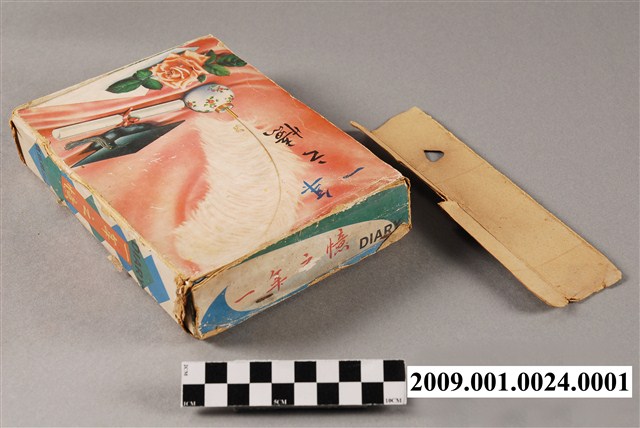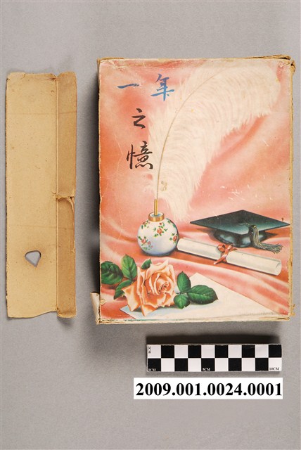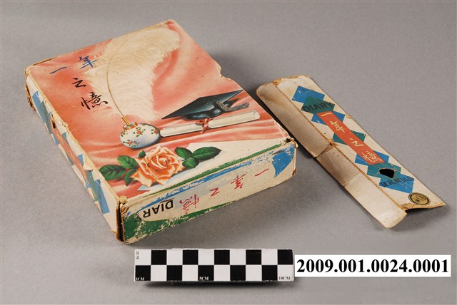 1.本件陸季盈1975-1976年日記書殼,封面是1塊粉紅色的布,上面放著方形學士帽、捲起的證書、1個圓形磁瓶上插著1支鵝毛筆,前方1張紙上放著1朵帶有綠葉的玻瑰花。書殼的書背已脫落,與書殼分離,印有「DIARY」、「一年之憶」、「寶島牌出品」等字,邊緣有些許破損情形,保存狀況尚可。