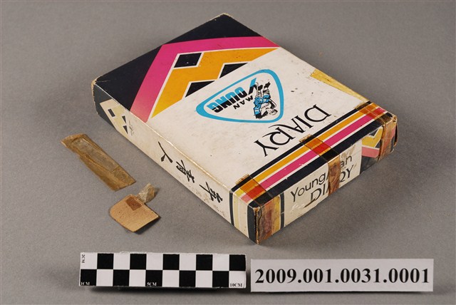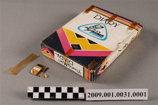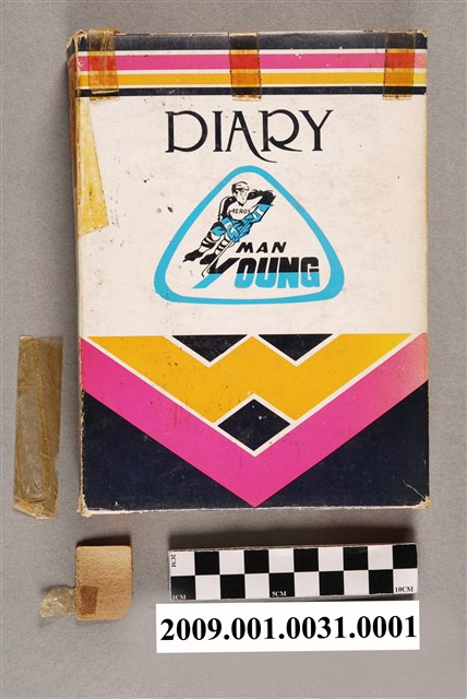 1.本件陸季盈1983年日記書殼正、反面圖案相同,封面上緣、下緣有黑色、黃色、粉紅色組合成的邊,中間偏上方有個圓弧的三角形,裏面是1名曲棍球員及「MAN YOUNG」等字,書殼的書背印有「年青人日記」及手寫「中華民國七十二年」等字,書殼邊緣有幾處粘貼過透明膠帶的痕跡,保存完整。