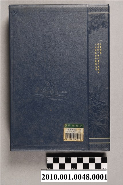 1.本件陸季盈2000年日記書殼為深藍色硬殼,封面與書背貼有帶框白紙印著「心語客棧」等字,背面右下角貼有老舊的銷售標籤,寫著「青青紙品」、「心語客棧日記--藍」等字,保存完整。