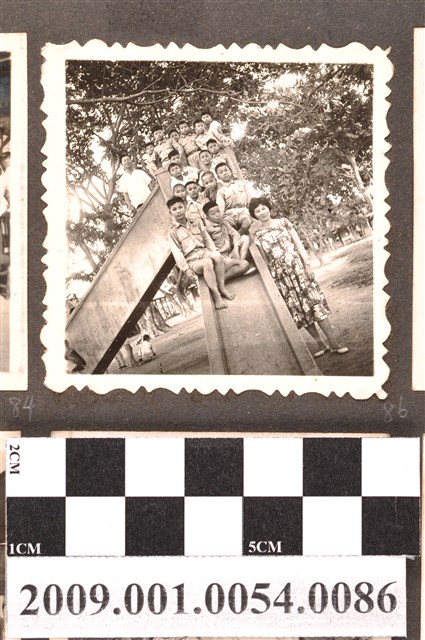 陸季盈二子陸振居(溜滑梯上學生群前面3排右2)與老師同學於校園溜滑梯合影,16名學生及1位男老師站在溜滑梯上,1位女老師站在溜滑梯旁,拍攝地點為高雄縣橋頭鄉五里林國小。