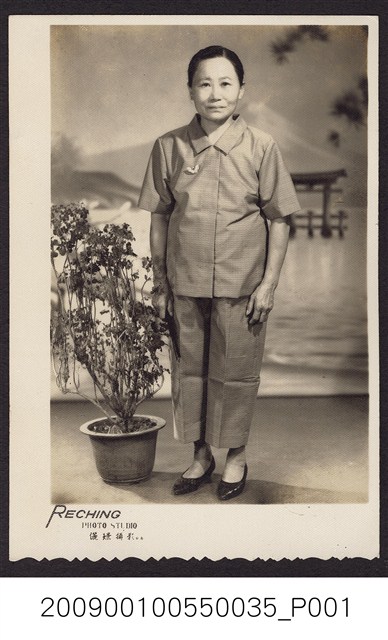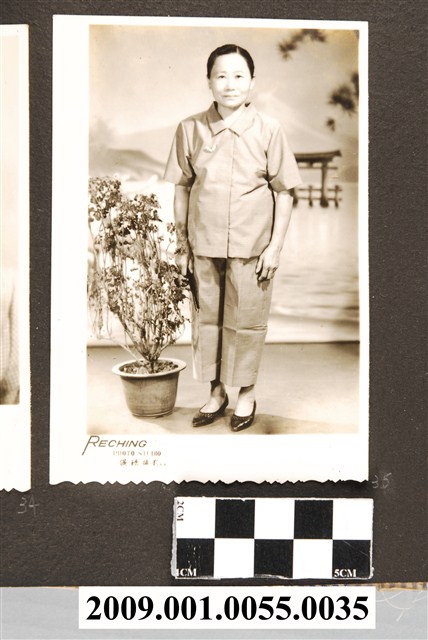2009.001.0055.0035 老年女子攝影棚內與盆栽黑白合照