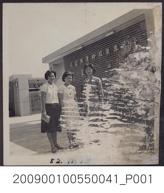 2009.001.0055.0041 穿洋裝女子三名於臺灣鳳梨公司鳳山工廠前留影