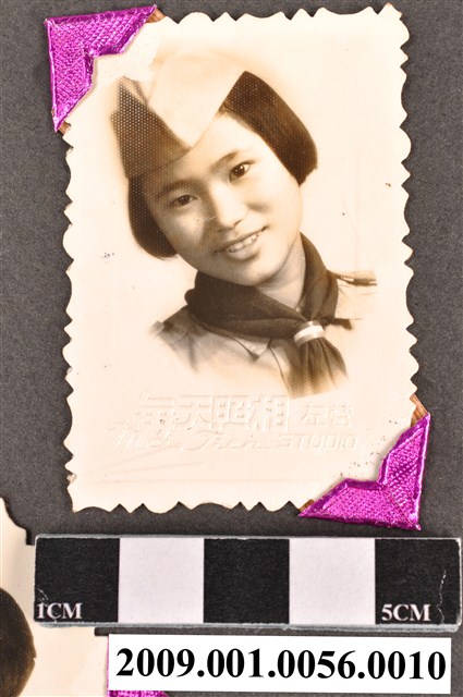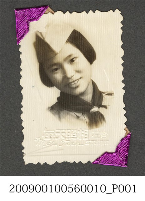 1.女子大頭照,頭著帽,頸著領巾。2.照片下方標示「每天照相 左莒 Mei Tien STUDIO」,應為照相館名。
