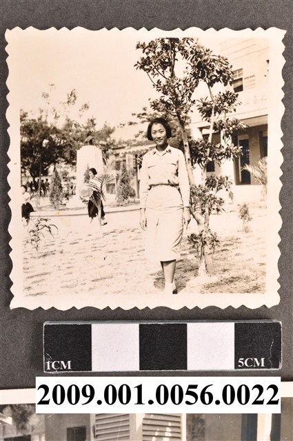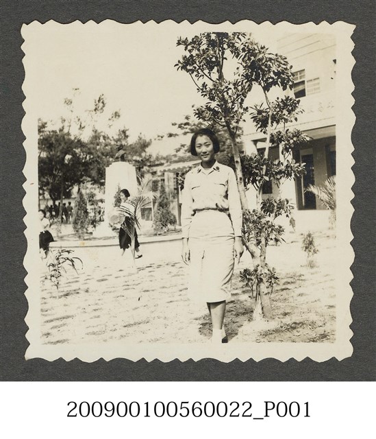 1女學生著制服於校園一處留影。2.依據背景左方銅像推測,校園可能為臺灣省立高雄高級木產職業學校(同2009.001.0054.0024)。
