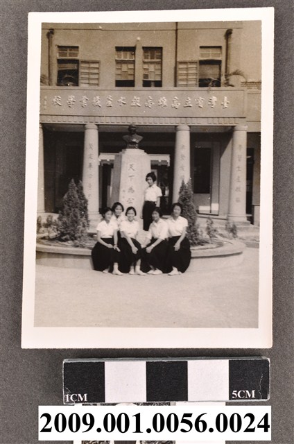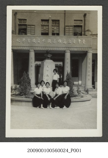 1.6位女學生著制服於校園一處合影,5人坐於花台邊緣,後方1人站於國父(孫文)銅像左邊。2.背景建築標示「臺灣省立高雄高級木產職業學校」,建物柱子左至右標示「學習生產技能」、「激發愛國??」、「堅定革命意志」。3.國父銅像基座標示「天下為公」。