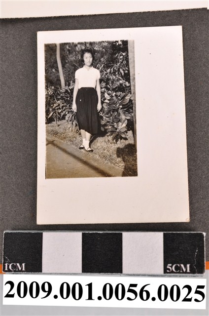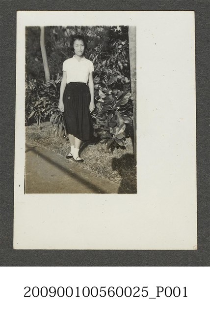1女學生著制服於校園一處合影。2.依據制服及相本關聯性推測,校園可能為臺灣省立高雄高級木產職業學校(同2009.001.0054.0024)。