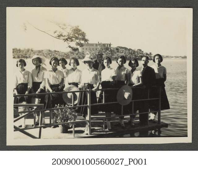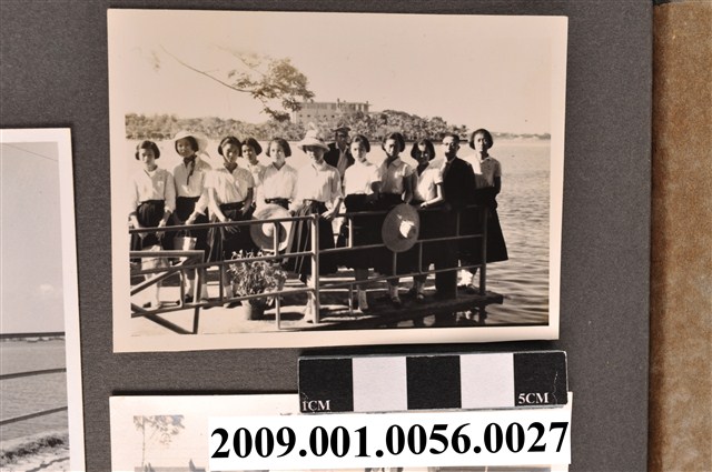 1.1位男老師著西裝、1位男學生及10位女學生著制服於船上一處合影。 2.成員可能同2009.001.0054.0027。 3.地點可能為大貝湖(現今稱澄清湖),同2009.001.0054.0030。