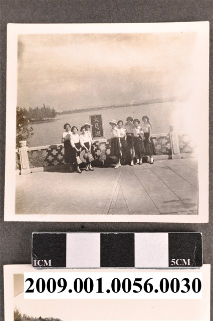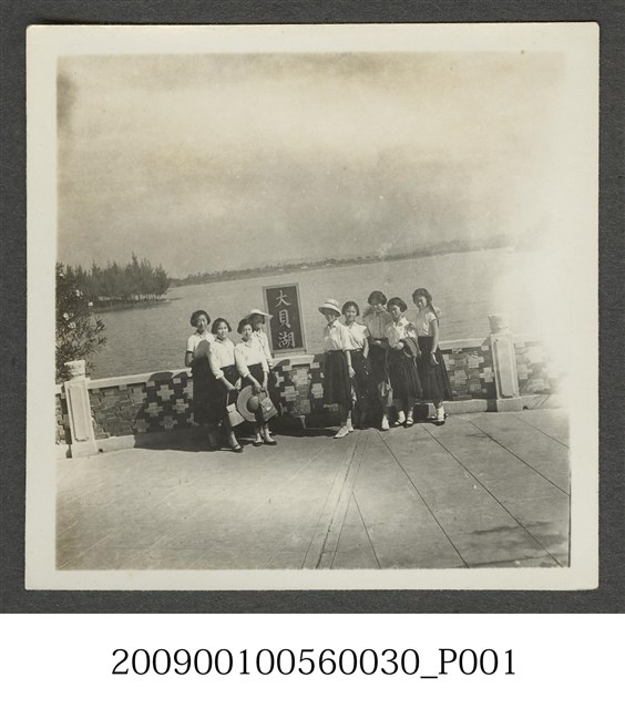 9位女學生於大貝湖(現今稱澄清湖)一處留影。