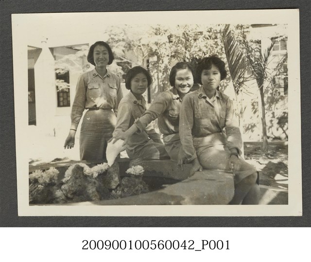 4位女學生著制服於水池邊合影。