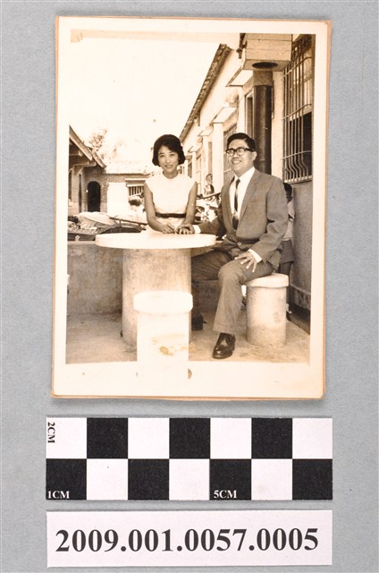 陸光惠夫婦訂婚坐在庭院合影,未婚夫恆幸身後躲著一個小孩。