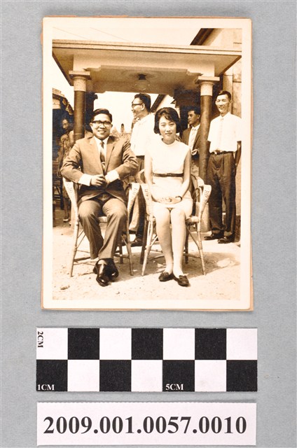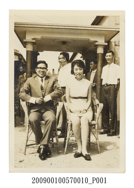陸光惠夫婦坐在藤椅上於庭院合影,兩人面對鏡頭微笑,後方有親友等4、5人。