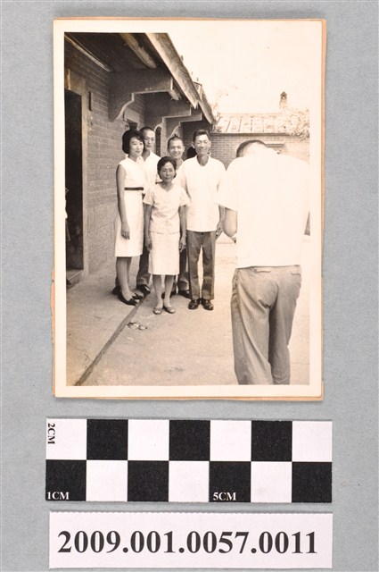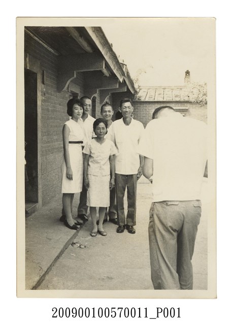 陸光惠與父陸季盈、母陸林迎、及兄弟於庭院拍照側拍,前方有攝影師背影。