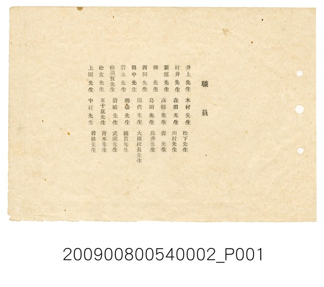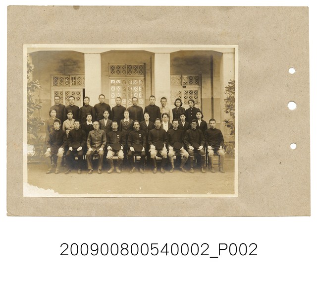 本件為屏東市榮國民學校教職員合照,收於昭和18年(1943)《高雄州屏東市榮國民學校第36屆結業紀念相冊》內,本照片有題名:「職員」。照片中教職員共計28人,前排正中央為校長大田太芽。