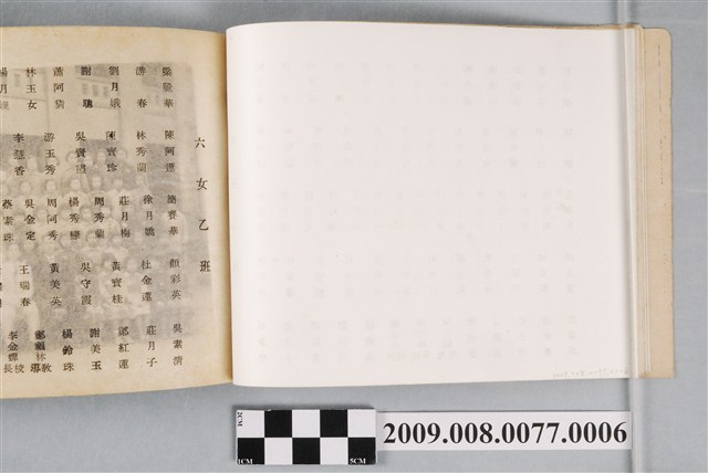 本件為六女甲班畢業班級團體照,收於民國42年(1953)7月製作《臺北市雙園國民學校第8屆畢業紀念冊》內。照片中學生共計67人,教職員3人,由左至右依序為吳有諒老師、李金蟬校長、鄭福林教導。