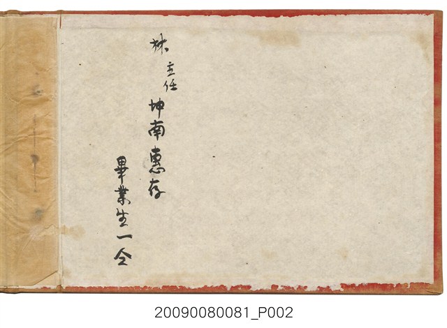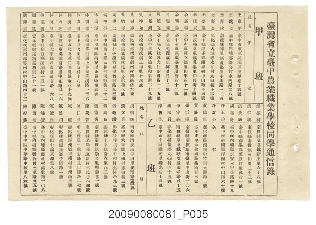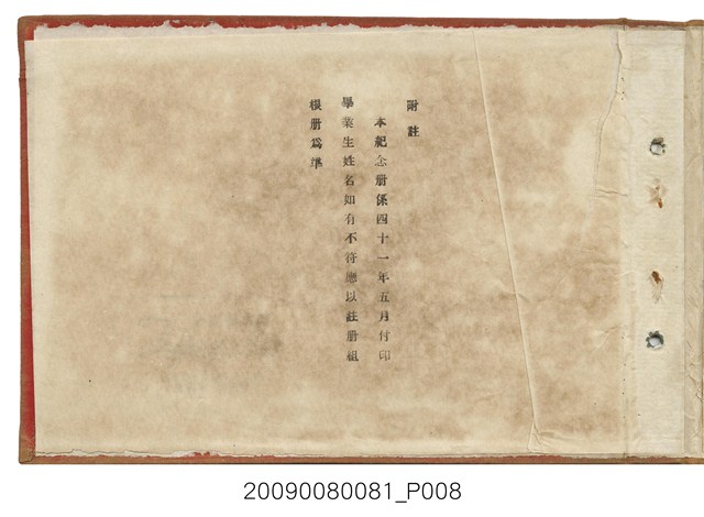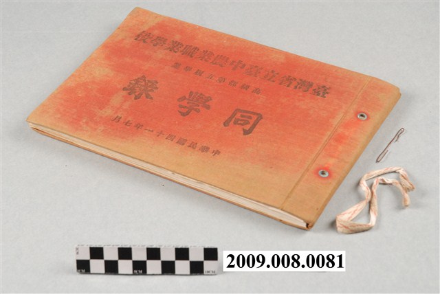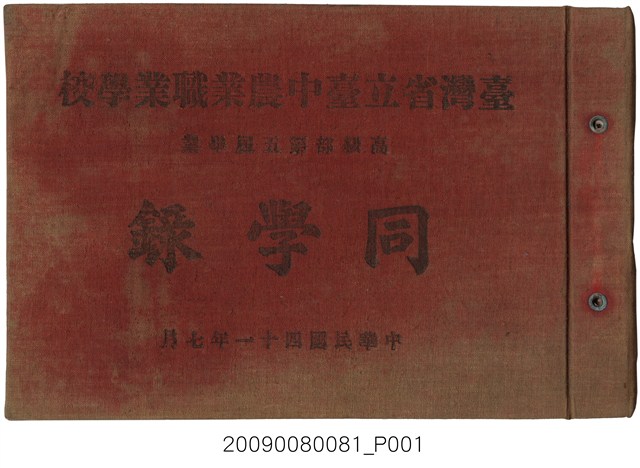 1.本物件為臺灣省立臺中農業職業學校高級部第五屆畢業生同學錄,封面為紅色硬底,封面上除印同學錄字樣外,中華民國四十一年七月,同學錄以白色棉繩裝訂在右側。內容包括通訊錄、校旗、校歌,以及教職員個人照、大頭照、校舍照、校園生活照等。
