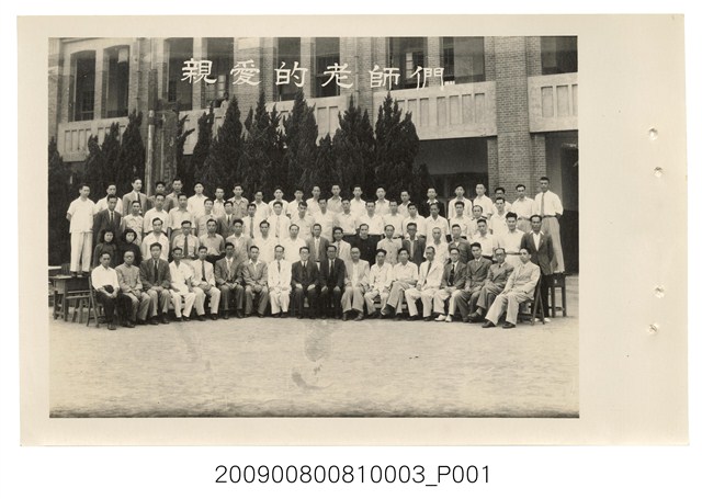 1.本物件為為臺灣省立臺中農業職業學校的校園生活。全體教職員合照,第1排成員坐於椅子上,第2排站立,最後一排則站於桌子上,第2排左1、2為合照中僅有之女性成員。後方有松柏樹木,照片背景為兩層樓磚造校舍,照片上並寫有「親愛的老師們」。