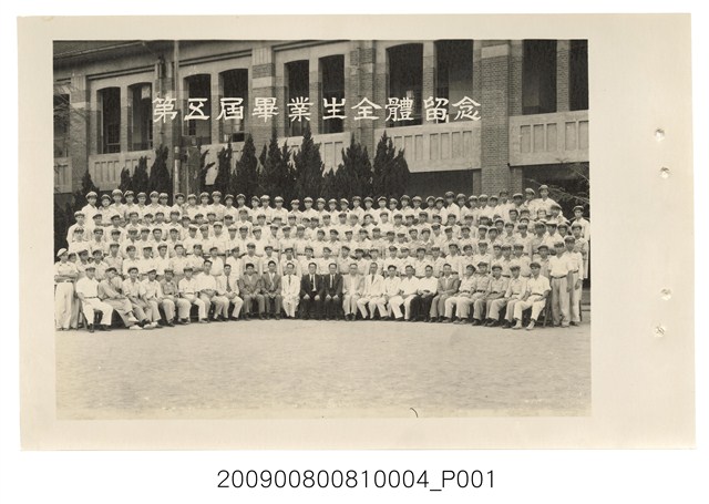 1.本物件為為臺灣省立臺中農業職業學校的校園生活。是師長與學生大合照,第一排師長與學生坐於椅子上,其餘則站立,所有學生皆著制服並戴帽入鏡,拍攝地點為升旗廣場,後方有松柏樹木,照片背景為兩層樓磚造校舍,照片上並寫有「第五屆畢業生全體留念」。
