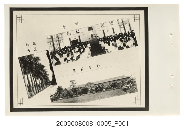 1.本物件為臺灣省立臺中農業職業學校的校園生活。3張照片組成,右上為週會照片,老師於禮堂講臺上,學生則坐於臺下,牆上有「自強不息」標語。右下照片為校舍前景,照片近處為一片稻田,再來有一排樹木在圍牆邊,最遠處有一排兩層樓校舍。左邊照片為椰子甬道,照片望去有一排相連之椰子樹直到盡頭。