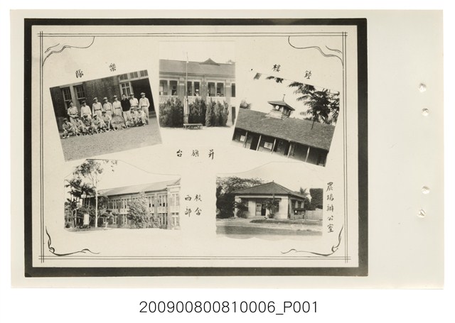 1.本物件為臺灣省立臺中農業職業學校的校園生活。有5張相片,為校內各處景觀照片,上排中間照片為升旗臺,座落於兩層樓校舍前方。右上照片為學校鐘樓,地點為一層樓校舍上方。右下為農場辦公室,為一層樓建築物,辦公室右邊有一告示欄,大門兩邊各有一棵樹與窗戶同高,四周並有樹木環繞。左下照片為西部校舍,為1排兩層樓建築物,校舍前方並有幾棵大樹。左上為樂隊合照,老師著深色上衣站於右側,學生則著制服戴帽,或蹲或站,地上擺放樂器。
