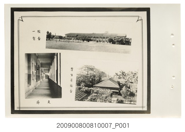 1.本物件為臺灣省立臺中農業職業學校的校園生活。由3張照片組成,右上為校舍一瞥,照片近處有體育活動器具如網球架,再來為升旗臺,校舍兩旁各有數棵大樹,最後面為兩層樓之校舍。右下為學生寄宿舍,照片由上往下拍,一排一層樓建築物座落於樹群中。左下為走廊照片,走廊左邊為教室,右邊為窗臺。