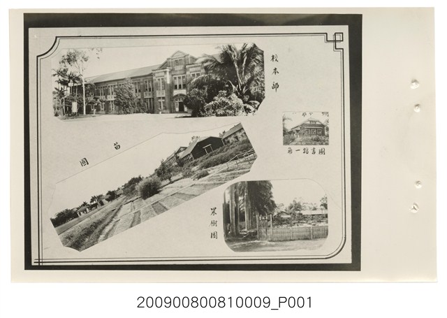 1.本物件為臺灣省立臺中農業職業學校的校園生活。有4張照片,右上為圖書館一角,圖書館矗立於樹群之中。右下照片為果樹園,以竹籬笆區隔出果樹園與一般通道,右邊並有1排高聳椰子樹。左下為苗圃照片,區分成一畦一畦,苗圃後方有數棟一層或兩層樓校舍。左上照片為校本部,校本部為一大棟兩層樓之建築物,四週有大樹環繞。