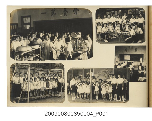 1.本文物為校園活動集錦1。本頁紙張泛黃,內貼有多張校園生活照:右側上方為與幼兒玩耍的合影;右側中間為在教室內聆聽關於臺灣營養問題的課程;右側下方為陪伴幼兒的合影。左側上方為在廚房打飯菜的畫面;左側下方為與幼兒玩耍的合影。諸多照片呈現校園多采多姿的生活。為2009.008.0085畢業同學錄編輯委員會編《台中家職學校同學錄》內頁之一。2.臺中家職創校於昭和10年(1935),初名為「臺中家政女學校」,昭和19年(1944)更名「臺中商業實踐女學校」。戰後經過多次改制,曾更名為「臺中市立家事職業學校」、「