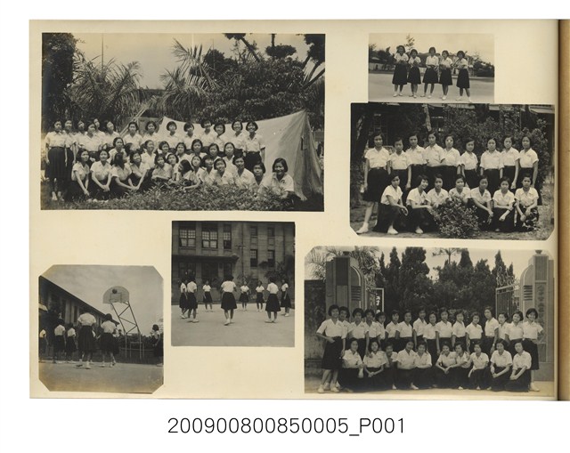 1.本文物為校園活動集錦2。本頁紙張泛黃,內貼有多張校園生活照:右側上方為學生打棒球的合照;右側中間為在校園花圃合影;右側下方為在校門口的合照。左側上方為在校園內搭帳篷露營的合照;左側下方兩張小照片為進行球類運動的畫面。諸多照片呈現校園多采多姿的生活。為2009.008.0085畢業同學錄編輯委員會編《台中家職學校同學錄》內頁之一。2.臺中家職創校於昭和10年(1935),初名為「臺中家政女學校」,昭和19年(1944)更名「臺中商業實踐女學校」。戰後經過多次改制,曾更名為「臺中市立家事職業學校」、「臺